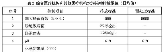 2、縣級及縣級以上或20張床位及以上的綜合醫療機構和其他醫療機構污水排放執行表2的規 定。直接或間接排入地表水體和海域的污水執行排放標準,排人終端已建有正常運行城鎮二級污水 處理廠的下水道的污水,執行預處理標準。